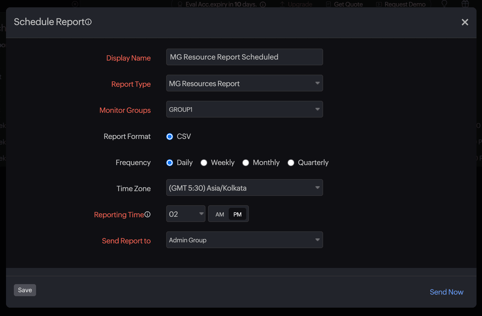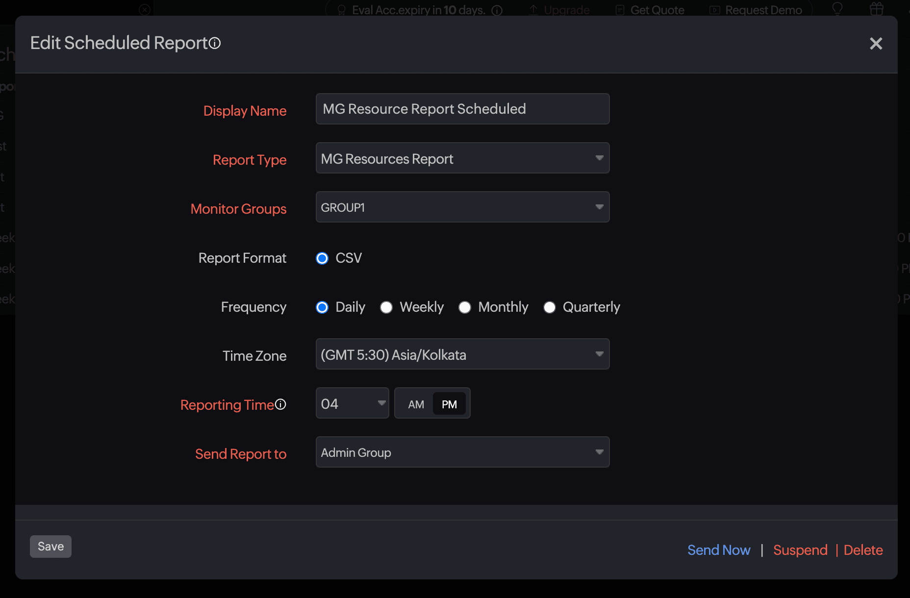 スケジュールレポートフォームに入力することで、MGリソースレポートのメールを指定した頻度で指定のアラートグループに送信するレポートタスクを作成できます。さらに、レポートは日次、週次、月次で送信し、CSVファイルとして添付することもできます。