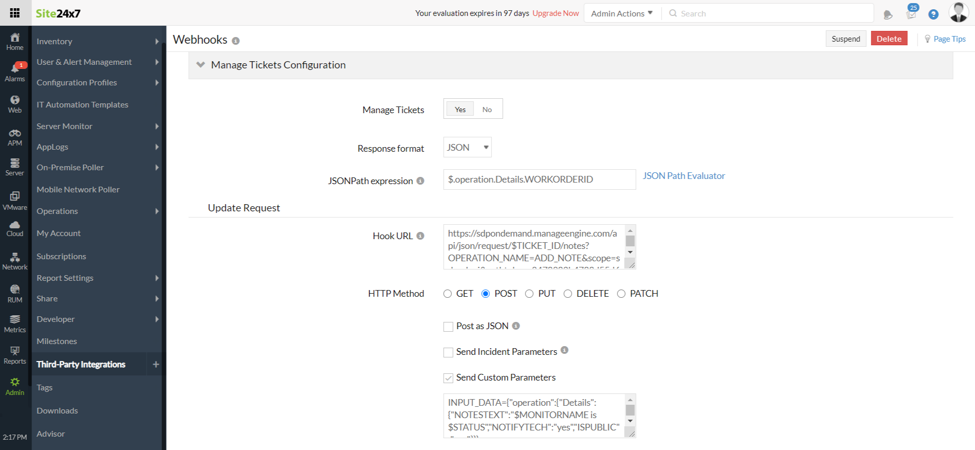 URL:Site24x7がデータを送信する完全なURL(http/httpsプロトコルを含む)。この更新URLにおいてチケットIDを動的に置換する必要がある場合、$TICKET_ID