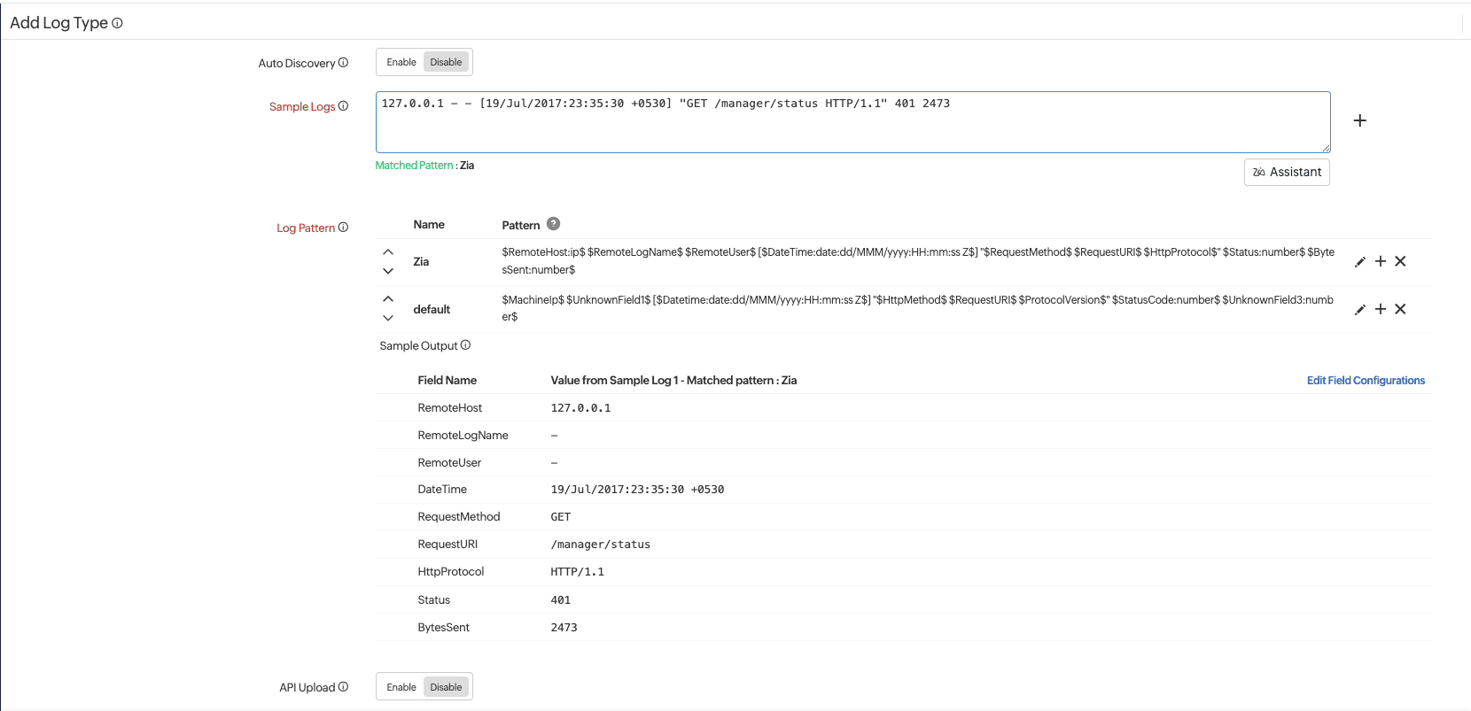- 「サンプルログ」の近くにある[Ask Zia]をクリックし、サンプルログパターンを指定して[生成]をクリックします。