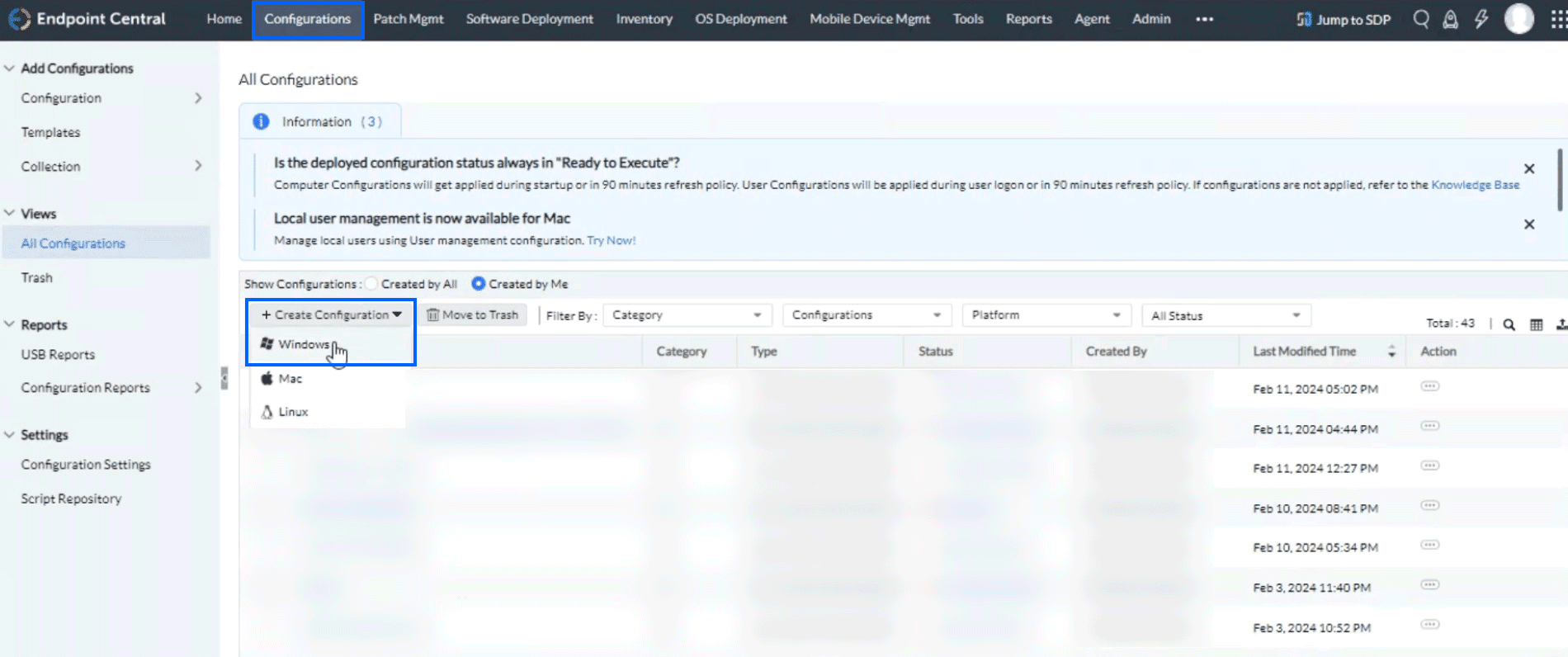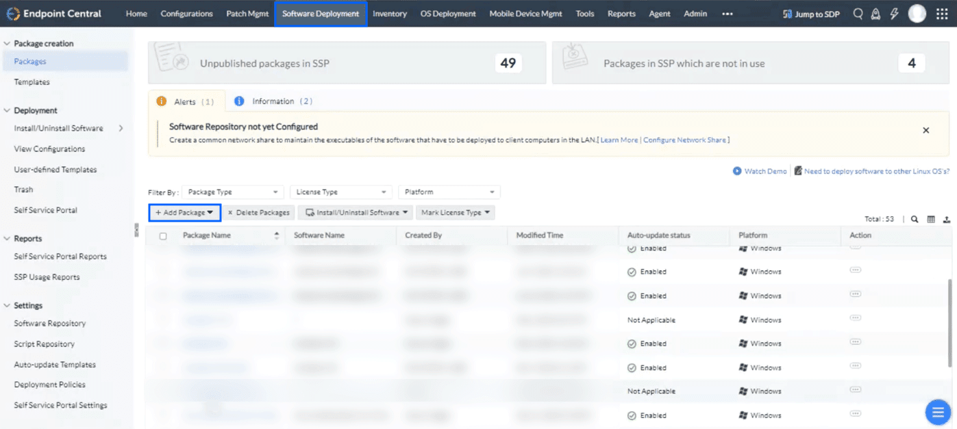 - ManageEngine Endpoint Centralポータルにログインし、[Software Deployment]タブをクリックします。