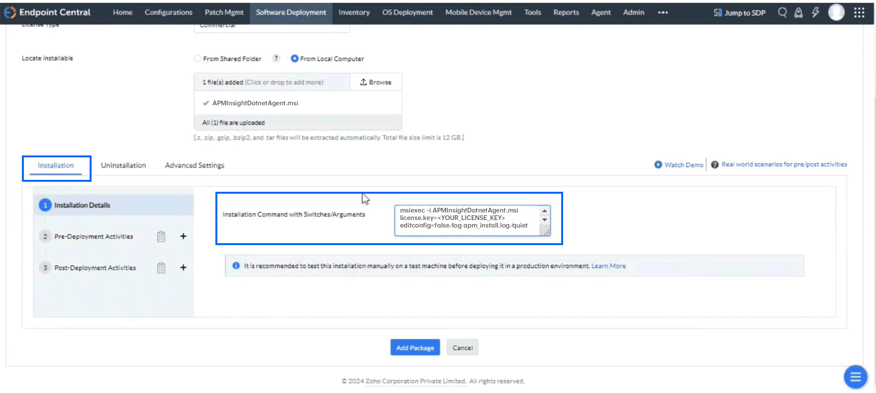 - [Installation]タブに移動し、[Installation Command with Switches/Arguments]ボックスに次のコマンドを入力します。