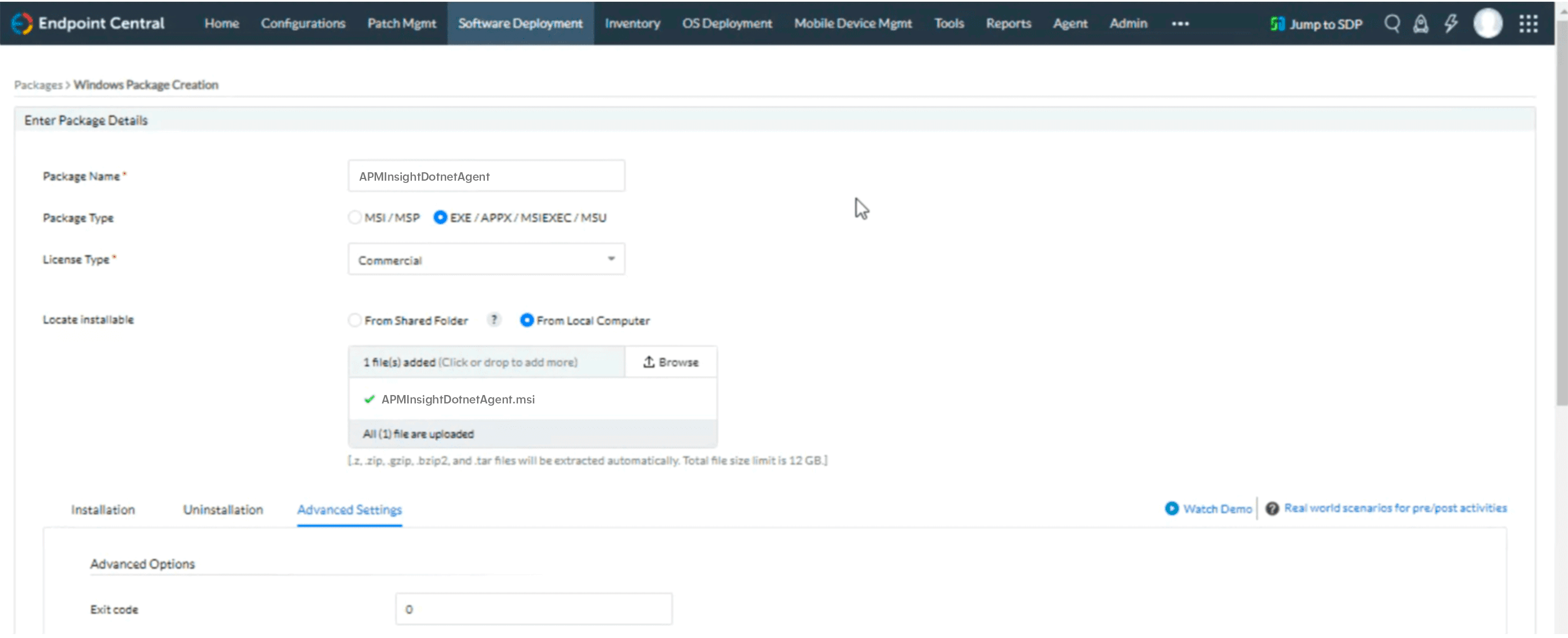 - Locate installable:ローカルコンピューターを選択し、ダウンロードしたMSIファイルをアップロードします。