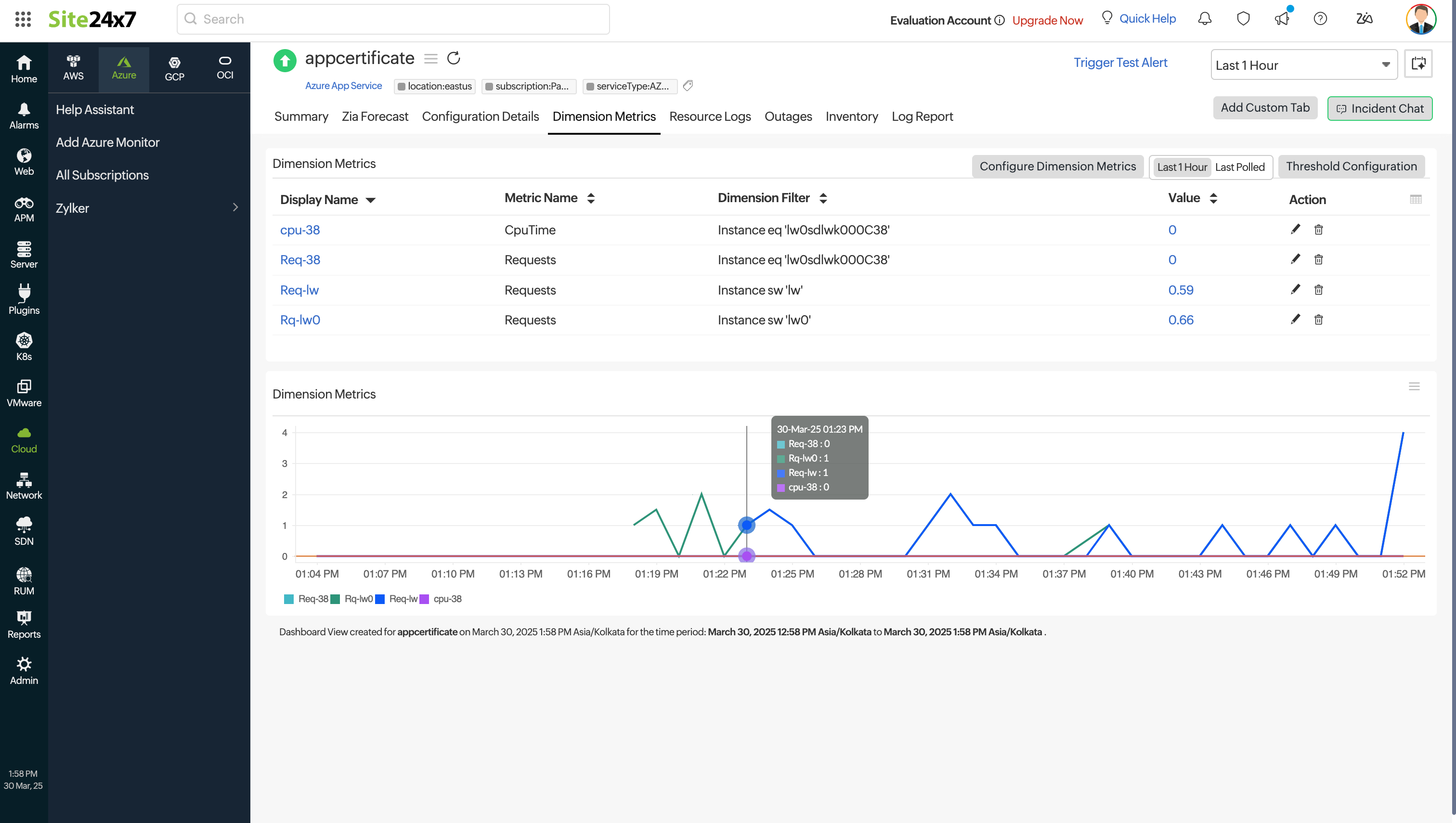 Site24x7 の予測エンジンでは、過去の観測データに基づいて、Azure App Service のパフォーマンスメトリクスの将来の値を予測できます。今後 7