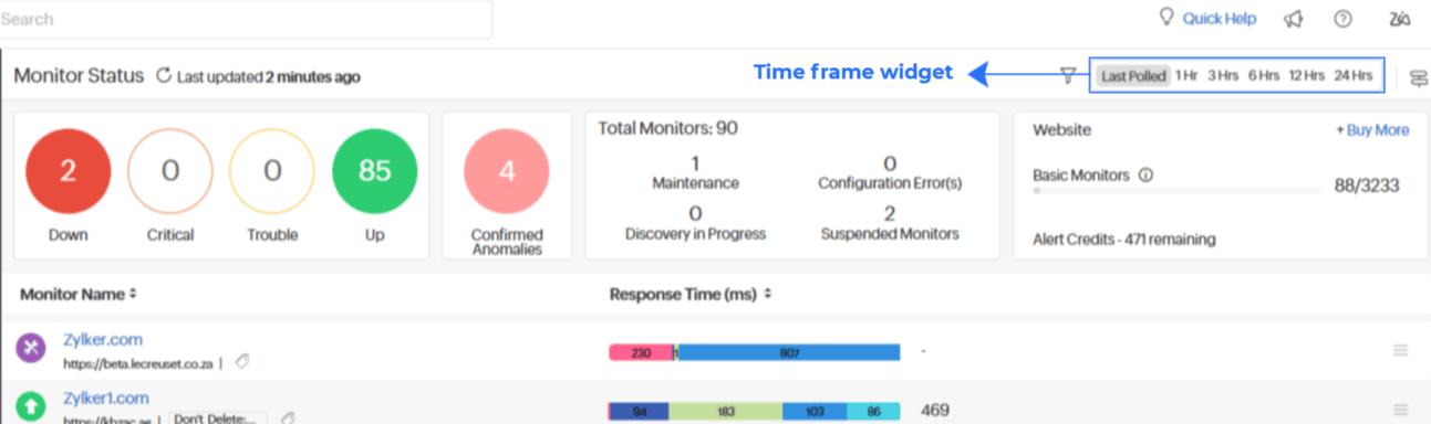 各監視の詳細ページで、[Time Frame]ウィジェットをクリックすると、監視タイプごとに異なる期間でのステータスを確認できます。