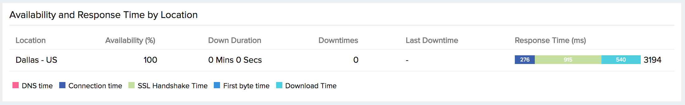 ロケーション別の可用性と応答時間表は、応答時間を構成する個々の属性を明確に区分し、設定されたすべてのロケーションにおける実際の時間をミリ秒単位で取得します。さらに、設定されたすべてのロケーションにおける可用性の割合やその他のダウンタイム指標も確認できます。