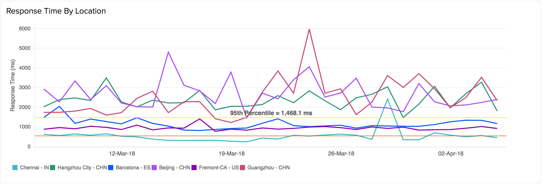 ロケーション別応答時間グラフは、選択した監視ロケーションにおける、選択した期間の平均応答時間と95パーセンタイル応答時間を表示します。生データの場合、平均値はすべてのデータ収集チェックに基づいて算出されます。時間別データの場合、平均値は時間ごとのポーリングカウントに基づいて算出されます。ロケーションの凡例を使用すると、ロケーションごとに個々の応答時間を分離できます。