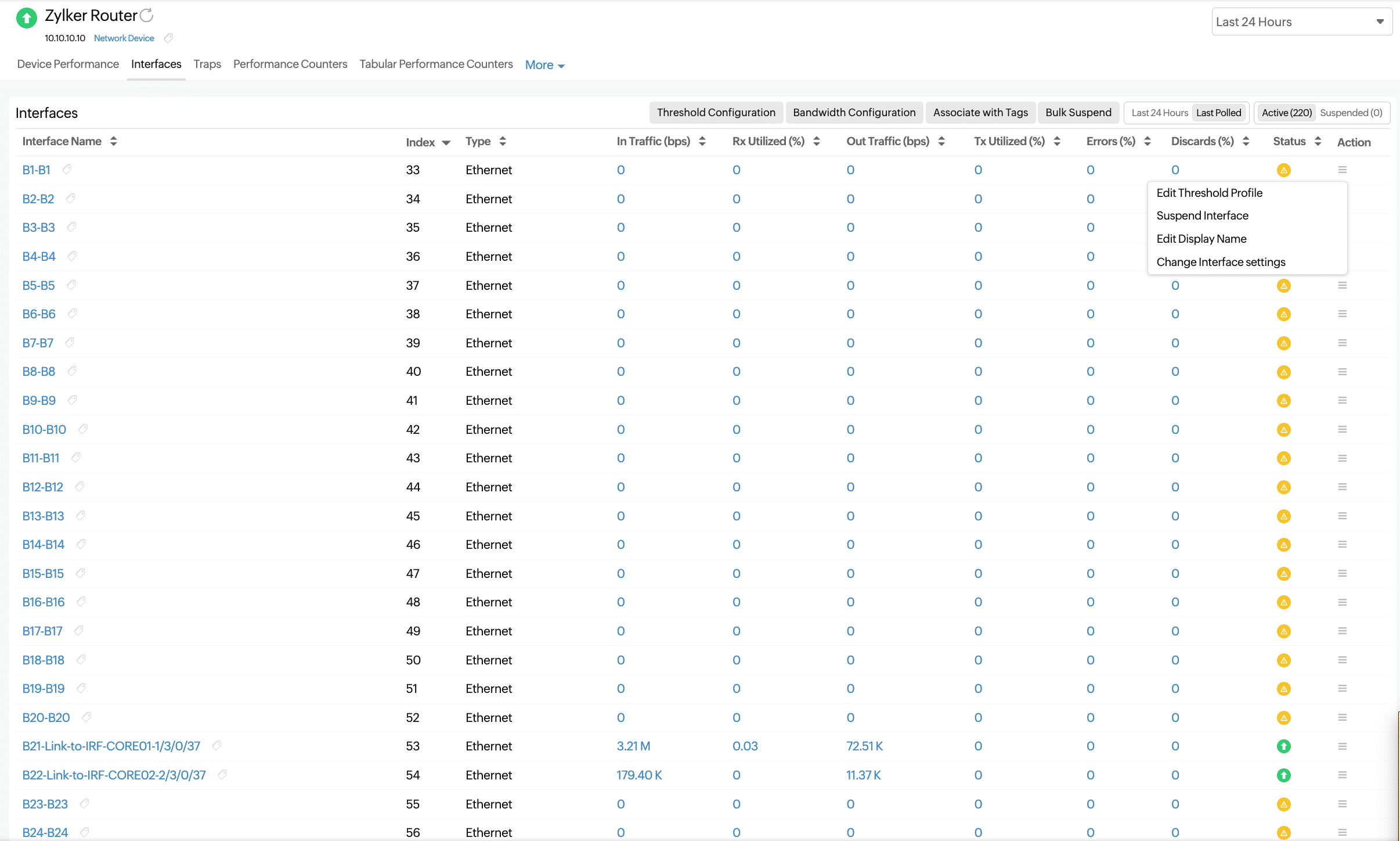 Action ハンバーガーアイコン()をクリックすると、しきい値プロファイルの編集、インターフェースの一時停止、表示名の編集、インターフェース設定の変更などのアクションが表示されます。